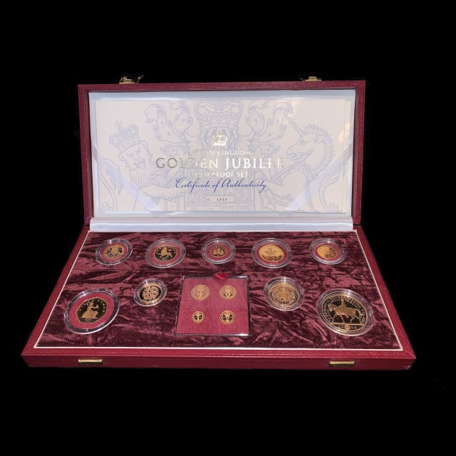 2002, contains a complete set of UK currency coins in gold: £5, £2, £1, 50p, 20p, 10p, 5p, 2p and 1p. The set also includes a set of the Queen's Maundy Money, again struck in gold. In total, this set includes more than 133 grams of pure uncirculated gold. In original maroon display case with booklet and certificate number 1717 of 2002 struck