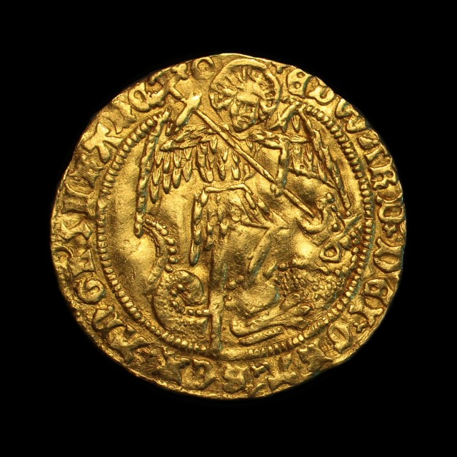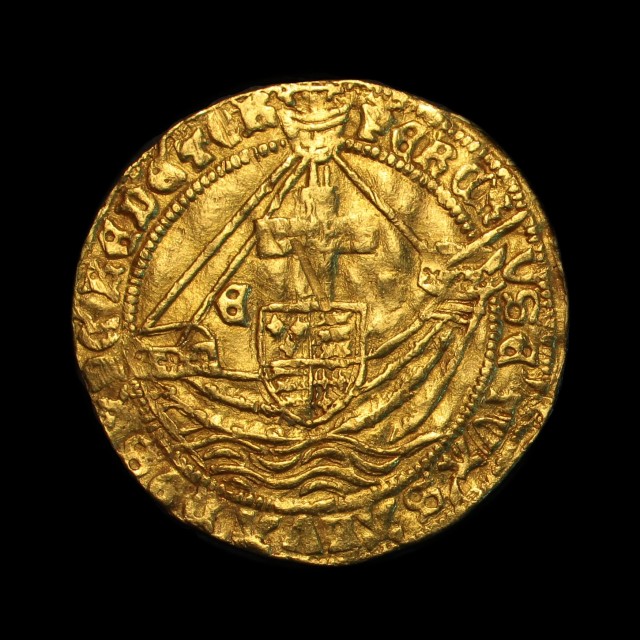London mint, type XIV, St. Micheal spearing the dragon, rev. ship with E and rose beside mast, mm. annulet,5.10g, (S.2091, N.1626). Light scratch on reverse, very fine