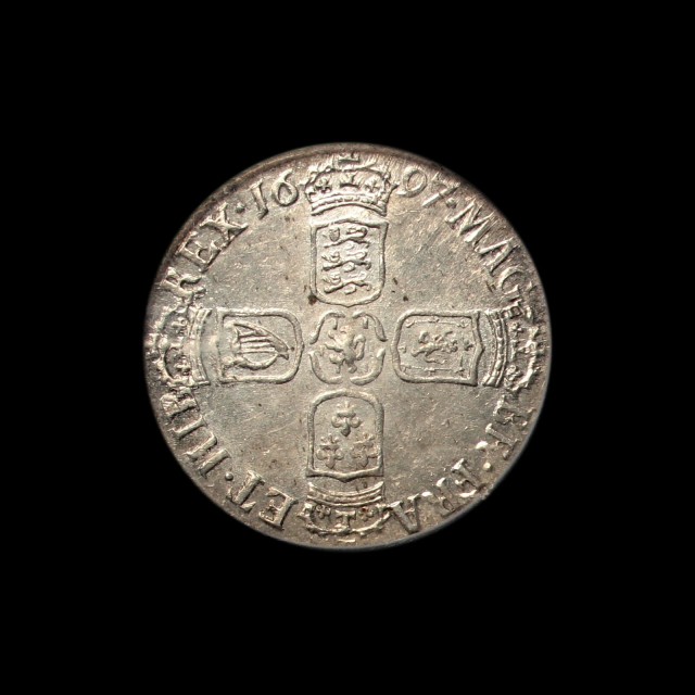 1697, third bust right, rev. crowed cruciform shields, large crowns, (S.3538, ESC.1233)