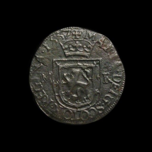 Issue of 11/12th alloy, crowned shield dividing MR, 1.73g, (S.5437). Minor striking crack at 10 o'clock but full and round, and a superb example of this difficult type.