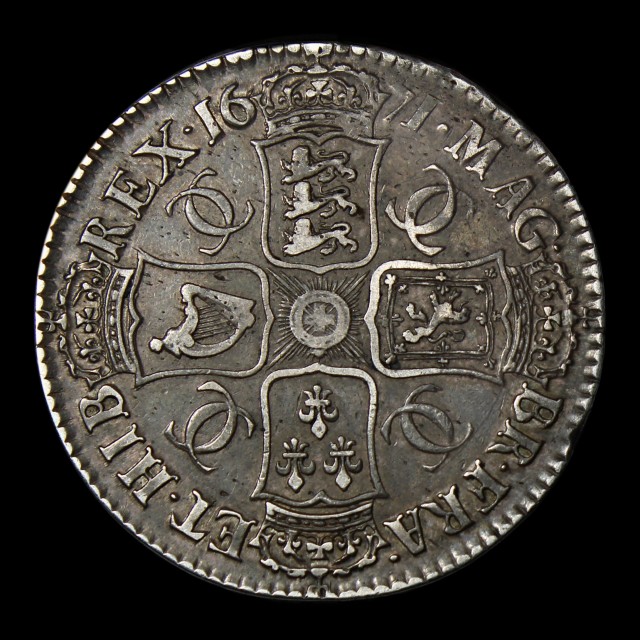 Third draped bust, 1671, B over R in BR, edge V. TERTIO (S.3358, ESC. 43)