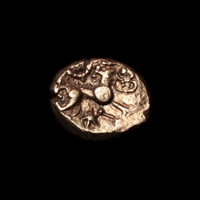 Opposing crescents with V symbols at terminals, trefoil of pellets above and below, line of pellets emanating from centre of crescents, rev. horse right with decorated face, solar ring above with trefoil of pellets within and beside, star below, 5.46g, (S.426, V.620-07, ABC1447). Very fine/nearly very fine and rare.