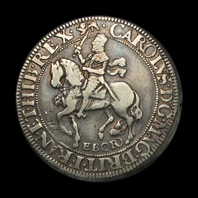 Type 7, horse's tail between legs, EBOR below horse, rev. shield with lion's skin garniture, mm. lion, 1643-4, 14.34g, (S.2869, N.2315). Centrally struck, nearly very fine.