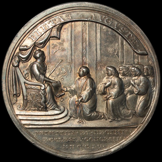 By J.Croker, obv. laureate and draped bust left, ANNA D:G: MAG: BRI: FR: ET. HIB: REG:, rev. Anne seated right, presents a charter to kneeling clergy. PIETAS. AVGUVSTAE. Exergue. PRIMITIIS. ET. DECIMIS. ECCLESIAE. CONCESSIS. MDCCIV, 44mm diameter, (MI ii 251.43, E.404). A couple of tiny edge knocks on reverse, attractively toned and extremely fine.
