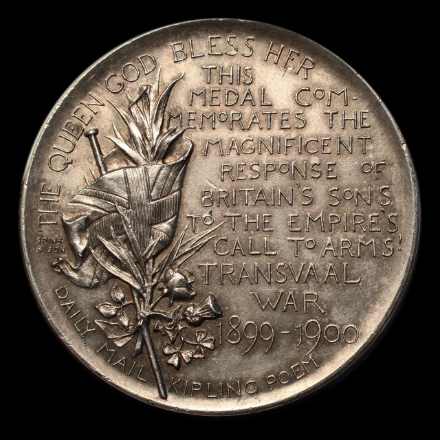 Note: This medal was sold by Spink & Son and advertised in the Daily Mail to raise money for the Kipling Poem War Fund. This aimed to assist those who were widowed and orphaned as a result of the South African war. The soldier depicted inspired the poem "The Absent Minded Beggar" by Rudyard Kipling.
