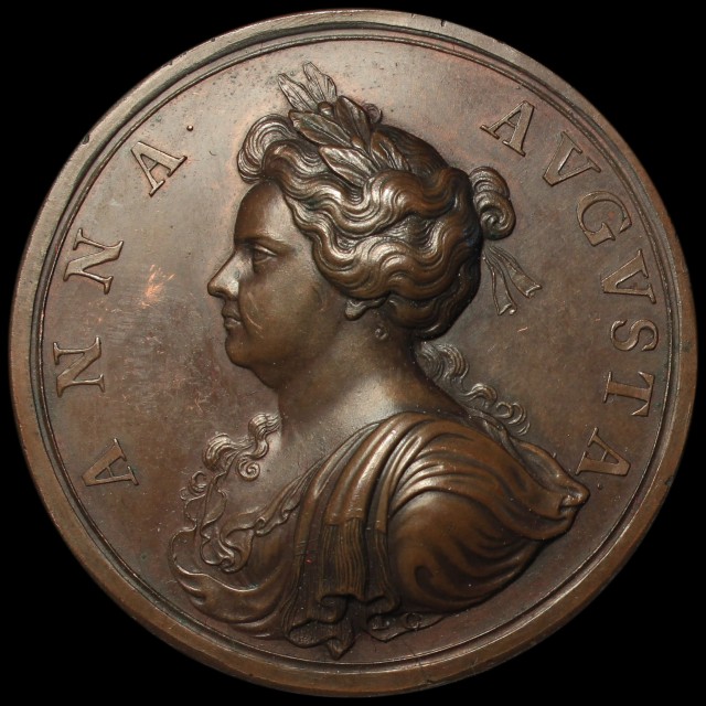By John Croker, bust of Queen Anne left, rev. a French officer surrenders to seated figure of Fortune, HOSTES AD DEDITIONEM COACTI, 44.5mm (MI 385/237, Eimer 450). About extremely fine