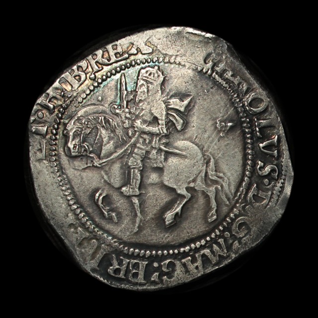 Group III, type 3a3, struck under Parliament, crude portrait of king on horseback l., no groundline below, mm. sun, 15.49g, (S.2778, N.2213). Struck on a heavy flan, some weakness of strike but with a good portrait, good very fine