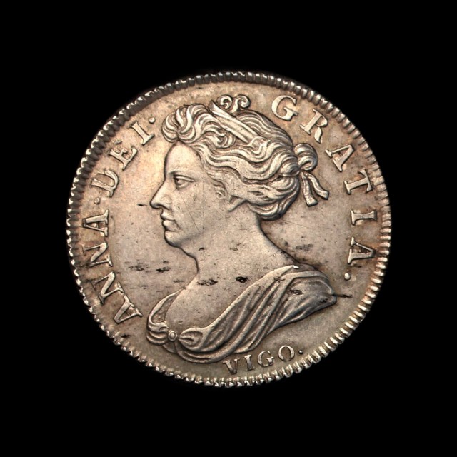 Pre-Union, 1702, first bust, VIGO below, rev. crowned cruciform shields, angles plain, (S.3585, ESC.1387)