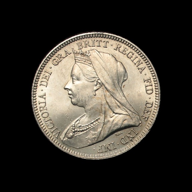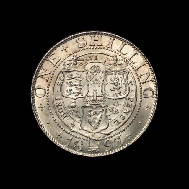 1893, old veiled head left, crowned shields in garter, date below, (S.3940, ESC.1361)