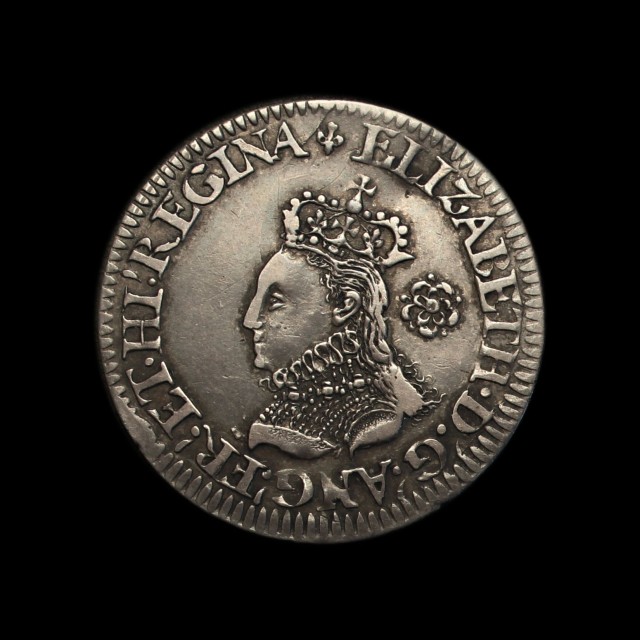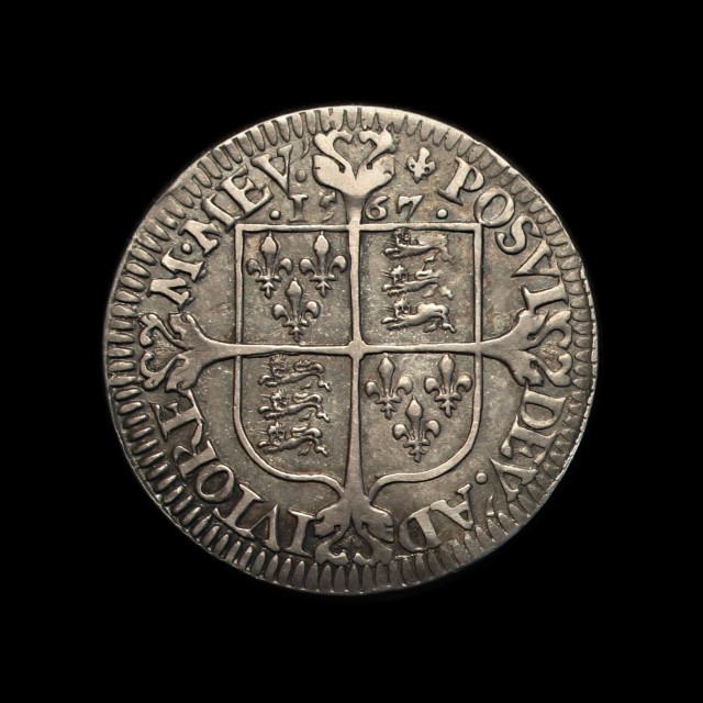 1567, small crowned bust left, rose behind, rev. quartered royal arms over long cross fourchée, small date above, mm.lis, (S.2599, N.2030). Even grey tone, good very fine or virtually so