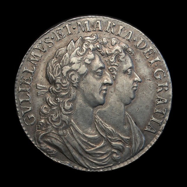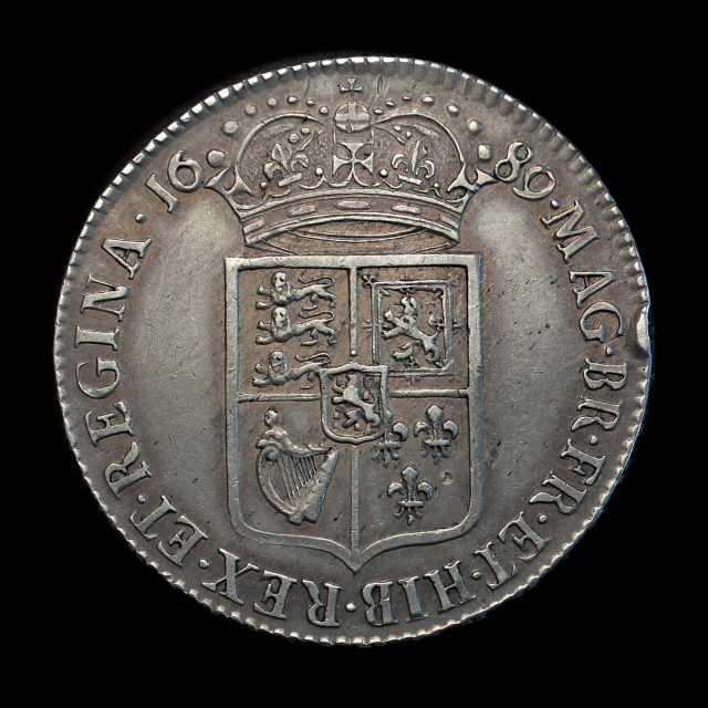 1689, conjoined first busts right, rev. crowned shield, caul only frosted, no pearls, edge PRIMO, (S.3435, ESC.839)