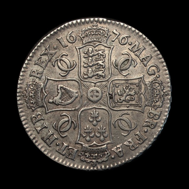 1676, fourth bust right, rev. crowned cruciform shields, interlinked C's in angles, edge OCTAVO, (S.3367, ESC.471)