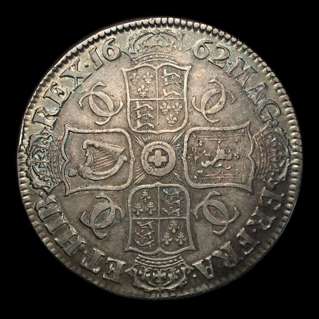 1662, laureate bust right, rev. crowned cruciform shields, interlinked C's in angles, edge undated, (S.3350, ESC.340)