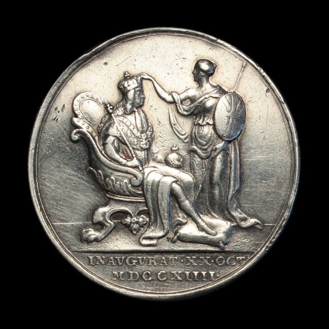 Official medal in silver by John Croker, laureate and draped bust right, rev. king enthroned right being crowned by Britannia,1200 struck, (Eimer 470, MI ii 424/9). Once cleaned and rather bright but starting to re-tone, otherwise good very fine