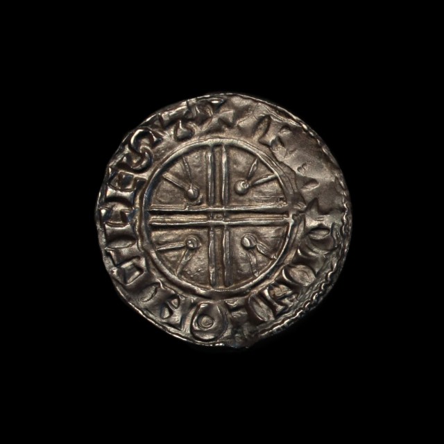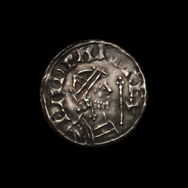 Chichester mint, moneyer Aelfwine, Helmeted bust right holdling sceptre, rev. short voided cross, 'pyramids' in angles, +ÆLPIN ON CICEST (sideways S), 1.30g, (S.1184, N.831). Minor stress mark across obverse, deeply toned and good very fine