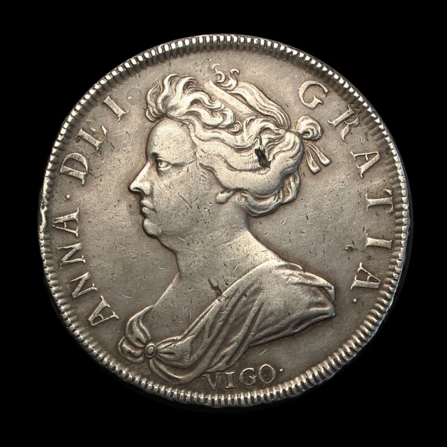 1703, draped bust left, VIGO below, rev. crowned cruciform shields, edge TERTIO, (S.3580, ESC.1358)