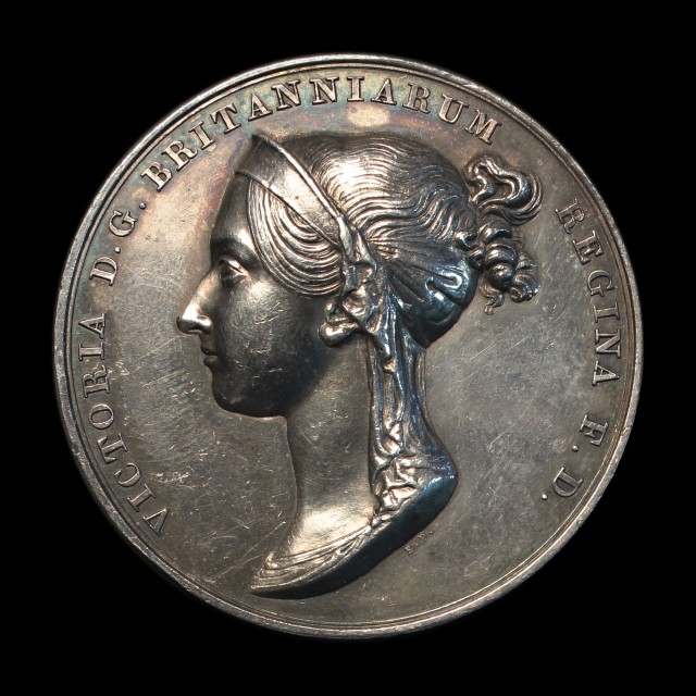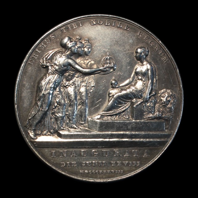 Bust left by Benedetto Pistrucci, rev. Britannia, Hibernia and Scotia offer the crown to Victoria,(E.1315, BHM 1801). Light tone and extremely fine