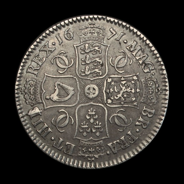 1671, third laureate but var. right, rev. crowned cruciform shields, interlinked C's in angles, edge V. TERTIO, (SCBC 3366, ESC 457)
