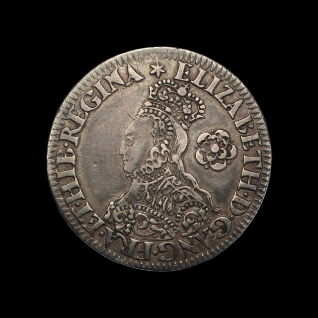 Tall narrow crowned bust left with decorated dress, Tudor rose behind, rev. Long cross fourchee over shield, date above, 3.06g, (SCBC 2595, N.2026). Even old cabinet tone, nearly very fine