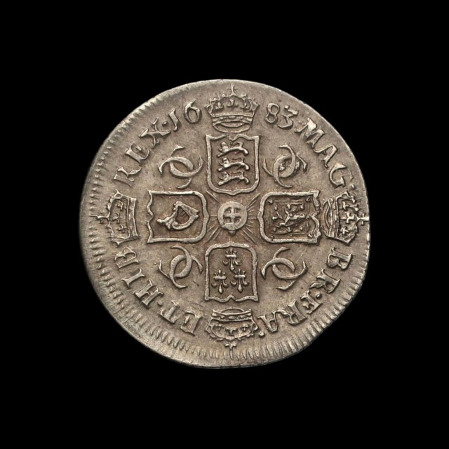 1683, laureate and draped bust right, rev. crowned cruciform shields, interlinked C's in angles, (SCBC 3382, ESC 580).