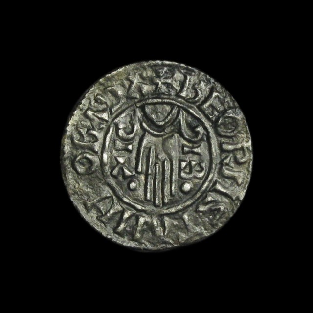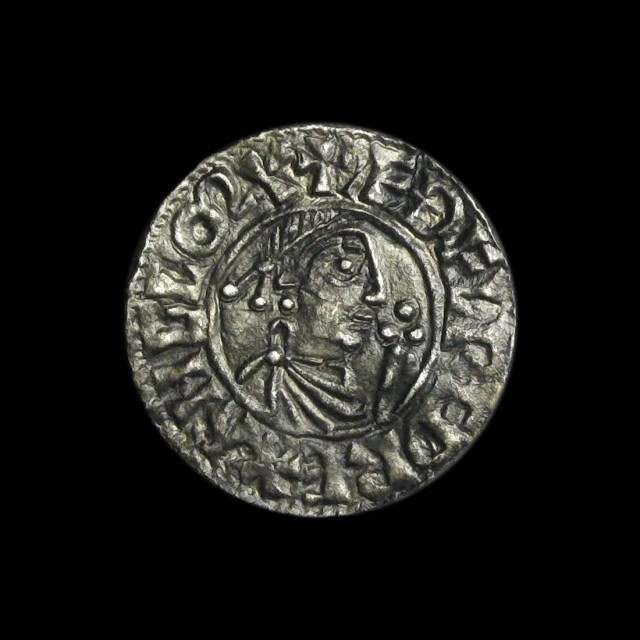 Moneyer Beorhstan, Obv. +ÆÐELRÆD REX ANGLOX, Rev. +BEORHSTAN M-O BΛDΛ, 0.86g (S.1146, N.768). Minor edge crack at 1 o'clock, dark tone, with an excellent portrait. The moneyer unlisted by North, the EMC and SCBI.