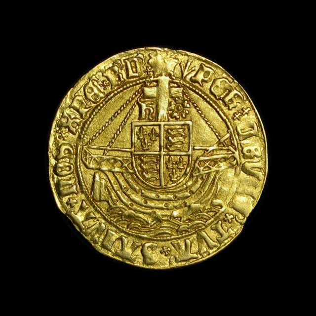St. Michael spearing dragon, saltire stops, rev. shield within ship, cross above dividing H and rose 5.12g, (S.2187, N.1698). Weak on St. Michael's head otherwise good VF, reverse better.