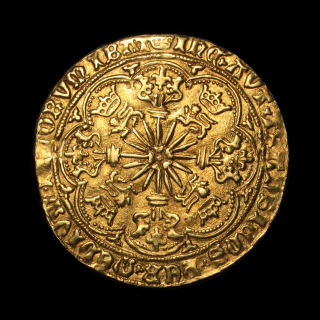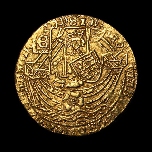 London, type VII, mm. -/crown, king crowned, standing facing in ship holding sword and shield, rose on hull, flag at stern, rev. rose on radiant sun over floriate cross, crowned leopards in angles, trefoil stops, large fleurs in spandrels, 7.65g, (S.1950, N.1549). Bold very fine.