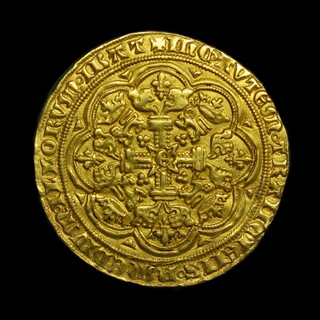 Series F/Ga mule, obv. saltire stops, letters E and C unbroken, R with curved tail (North 12), rev. lis in second quarter, large E in centre, annulet stops, mm.cross3, 7.60g, (S.1489/1490, Schnieder 40 - same reverse die, N.1173/1179a). Struck from a rusty obverse die otherwise better than very fine.