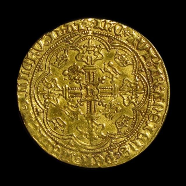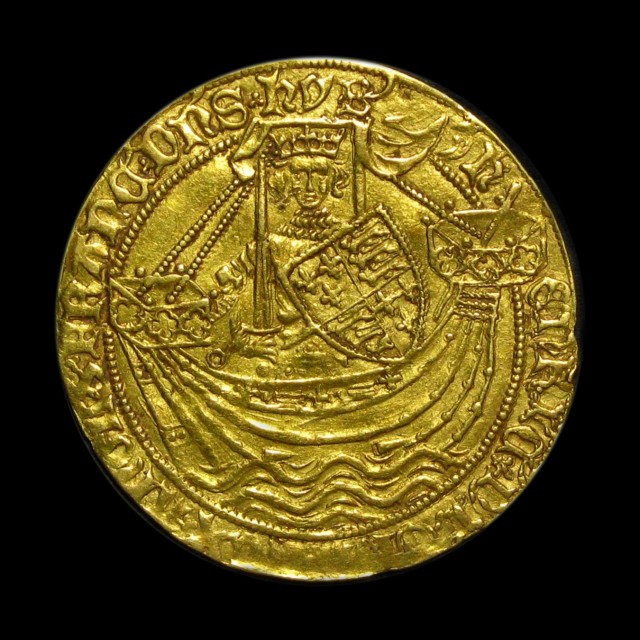 London, king in ship, annulet by sword arm, lis after h/enric, then trefoil stops, legend ends HYB, rev. H in centre, annulet in 2nd quarter, cinquefoil after Ihc, then annulet stops, 6.83g, (N.1414; S.1799). Small mark by face, otherwise about good very fine/very fine.