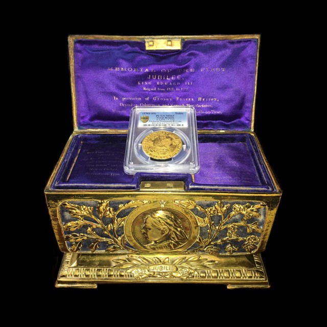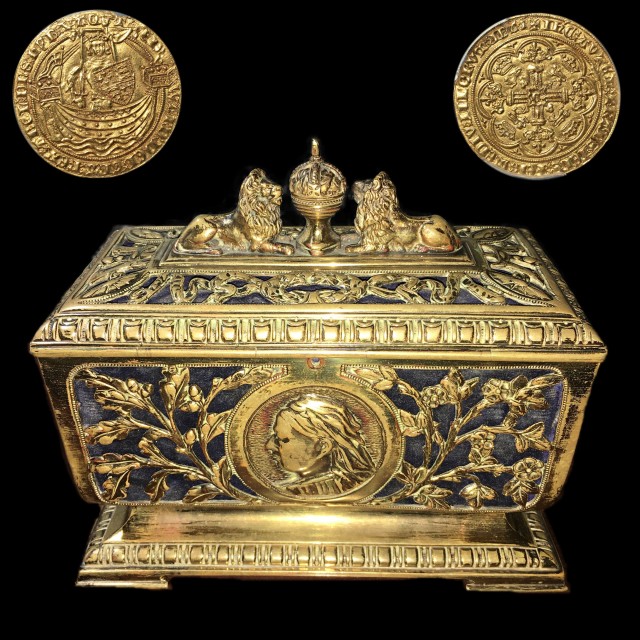 This coin was found in the vicinity of Austin Friary when work commenced on the viaduct for Manors Station in 1887. The site manager sent it to Queen Victoria for a jubilee present but it was returned to the finder in the gilded casket you see here. A unique opportunity to find a mint state Edward III noble with a Royal provenance