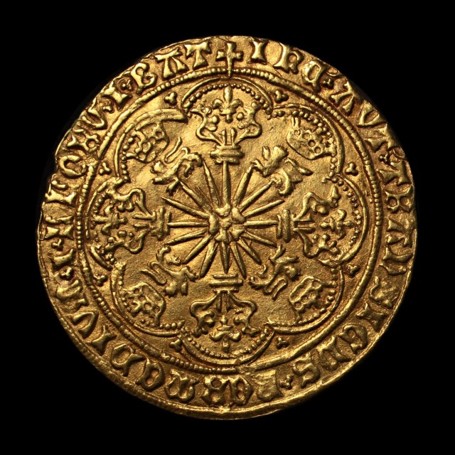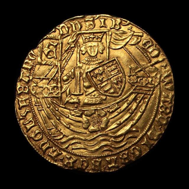 London, type X, mm. -/long cross fitchee, king crowned, standing facing in ship holding sword and shield, rose on hull, flag at stern, rev. rose on radiant sun over floriate cross, crowned leopards in angles, trefoil stops, small trefoils in spandrels, 7.66g, (S.1951, N.1549, Schneider 379/378).Quite full and round, good very fine or better, scarce, the first we have had with this mint mark