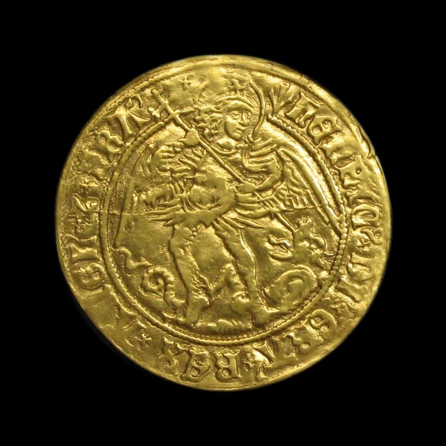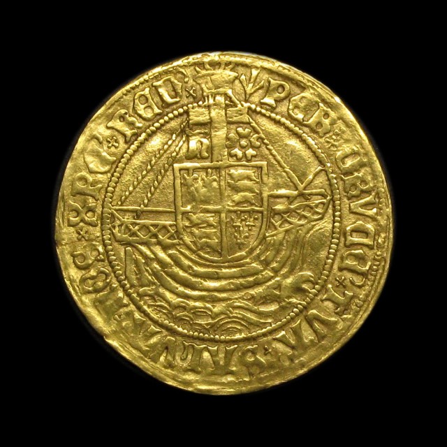 St. Michael spearing dragon, saltire stops, rev. shield within ship, cross above dividing H and rose 5.04g, (S.2187, N.1698). Struck on a well spread flan with good detail to St. Micheal, bold very fine.