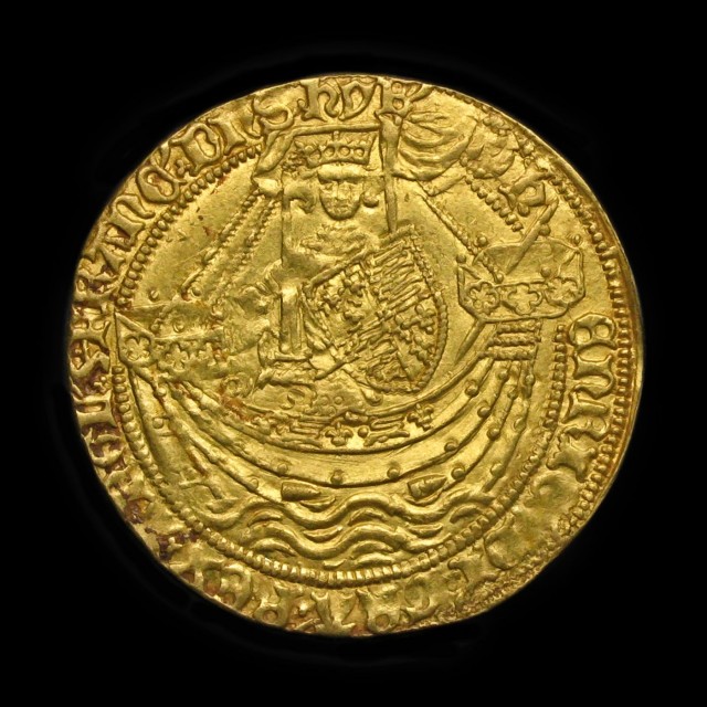 London, king in ship, annulet by sword arm, lis after h/enric, then trefoil stops, legend ends HYB, rev. H in centre, annulet in 2nd quarter, cinquefoil after Ihc, then annulet stops, 6.93g, (N.1414; S.1799). Obverse a touch off-centre, on a full round flan and good very fine.