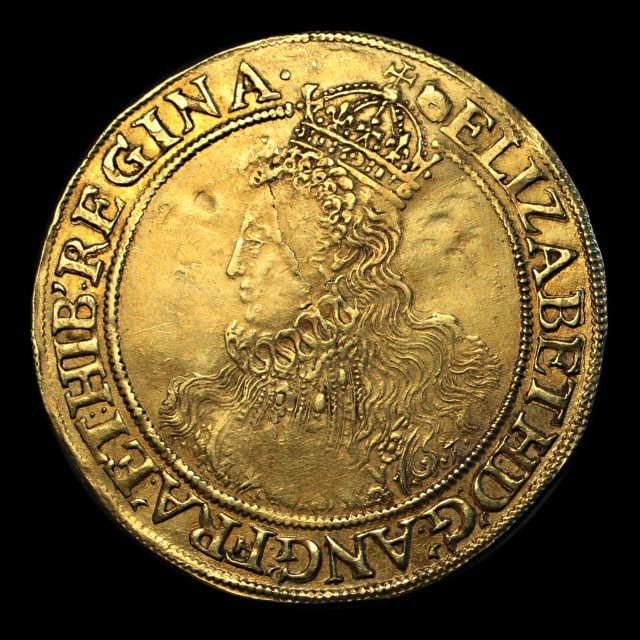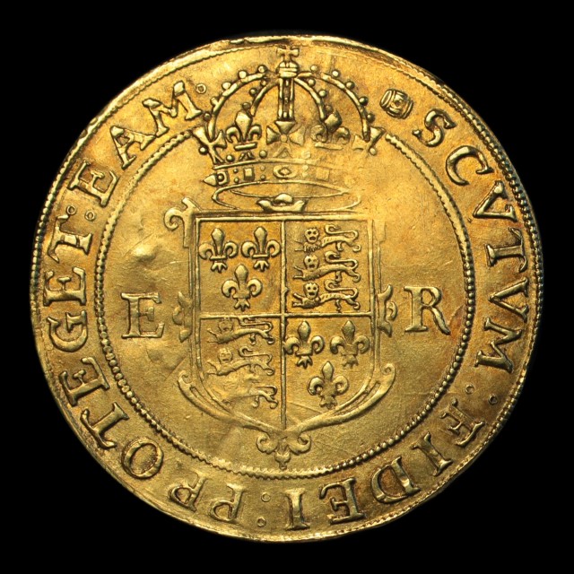 Elaborately decorated bust left, mm. tun, rev. crowned shield dividing ER, mm. to right of crown, 11.13g, (S.2534, N.2008). Evidence of light crease running from 1 o'clock to 7 o'clock (obv) and a metal lamination/flaw on the portrait (not a crack), otherwise full, round and very fine, rare