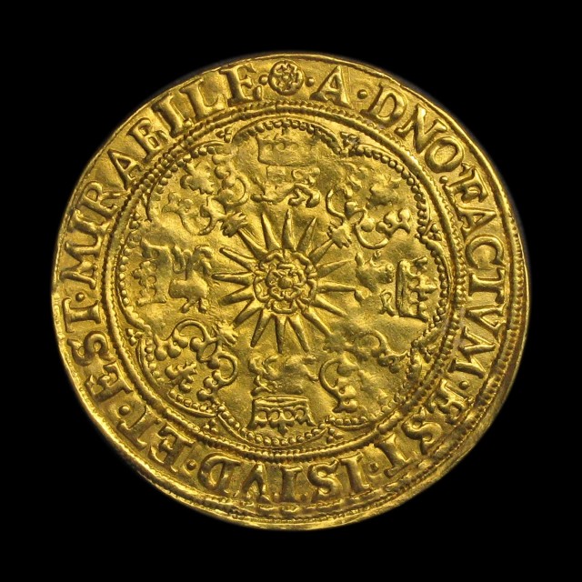 Fine gold, mm. rose, king standing facing in galleon holding sword and shield, flag with letter I on forecastle, rev. floriate cross, rose on sun in centre, leopards and crowns around, 6.81g, (S.2614, N.2080). Minor weakness of strike to the king's left shoulder, very fine and better and very rare.
