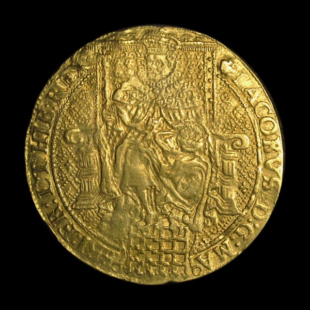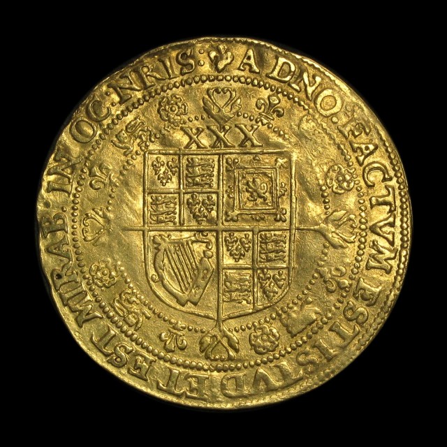 King enthroned holding orb and sceptre, portcullis below, rev. shield on cross fleury with XXX above, mm. lis, 1623-4, 12.43g, (S.2632, N.2108). Obverse a little weak in parts, nearly very fine/very fine and very rare.