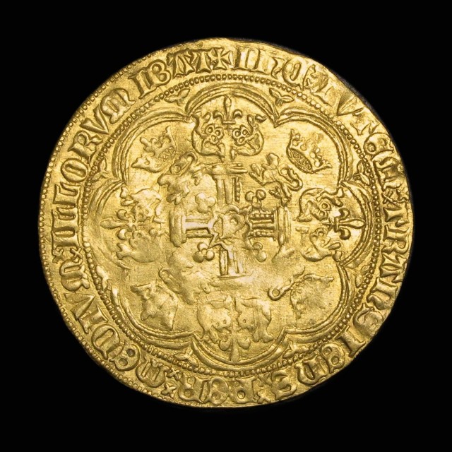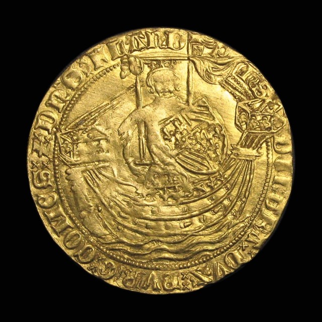 Duke of Burgundy and Count of Flanders crowned and standing in ship with sword and shield, Arms of France and Burgundy quartered, rev. “P” at centre, large fleurs in spandrels, 6.87g (Delm 474, F169). Full flan, some striking weakness to portrait, very fine and very rare.