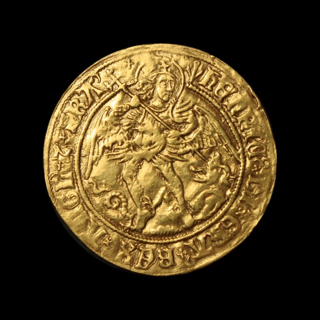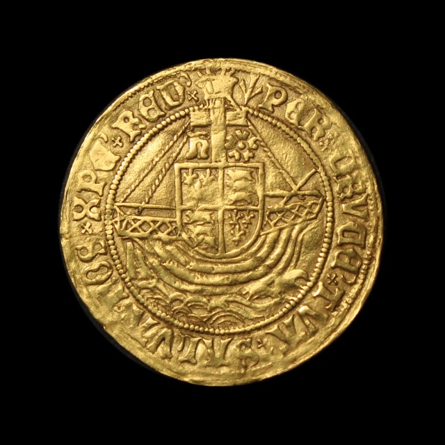 St. Michael spearing dragon, saltire stops, mm.pheon, rev. shield within ship, cross above dividing H and rose 5.04g, (S.2187, N.1698). A touch bright but struck on a well spread flan with good detail to St. Micheal, bold very fine.