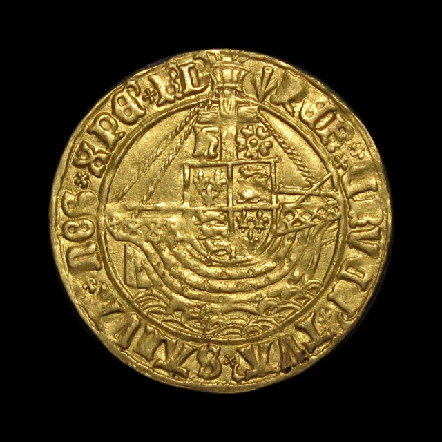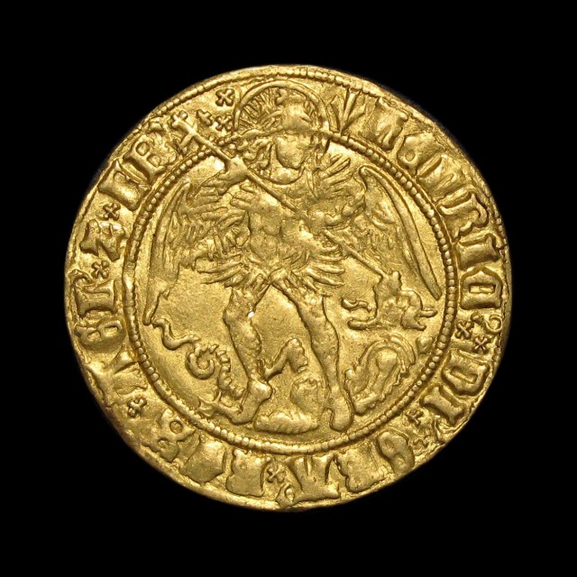 St. Michael spearing dragon, saltire stops, rev. shield within ship, cross above dividing H and rose 5.14g, (S.2187, N.1698). Evenly struck, well centred and almost good very fine.