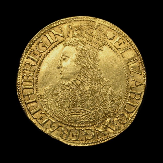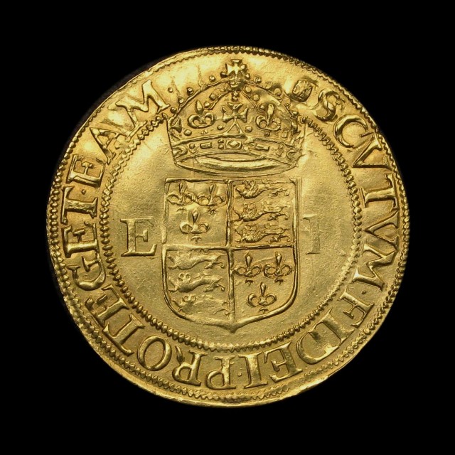 Queen wearing elaborately decorated dress, rev. crowned sheild dividing ER, mm.tun, 5.63g, (S.2535, N.2009). An attractive example, almost extremely fine.