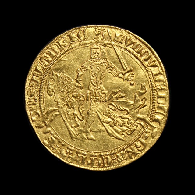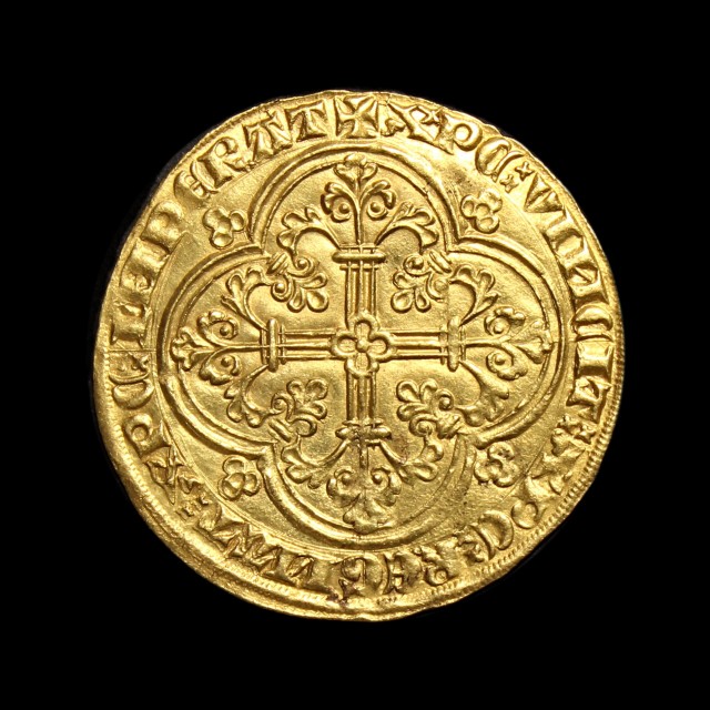 Armored knight on horseback galloping left brandishing a sword, rev. cross fleurée in qudrilobe with leaves at angles and trefoils in spandrels, 3.83g, (Fr.156, Schneider 142, Delm. 458). Choice extremely fine and much as struck.