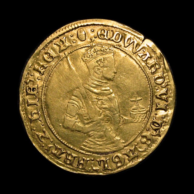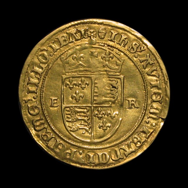 Half length figure of king in armour standing holding orb and sword, rev. crowned shield dividing E R, mm. tun, 5.46g, (S.2451, N.1928). Minor evidence of old crease, nearly very fine/very fine.