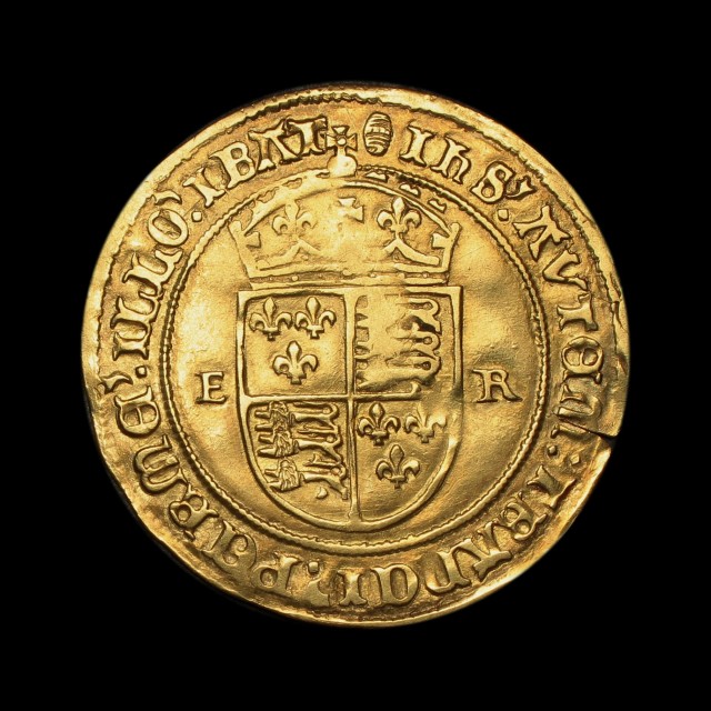 Half length figure of king in armour standing holding orb and sword, rev. crowned shield dividing E R, mm. tun, 5.46g, (S.2451, N.1928). Minor evidence of old crease, nearly very fine/very fine.