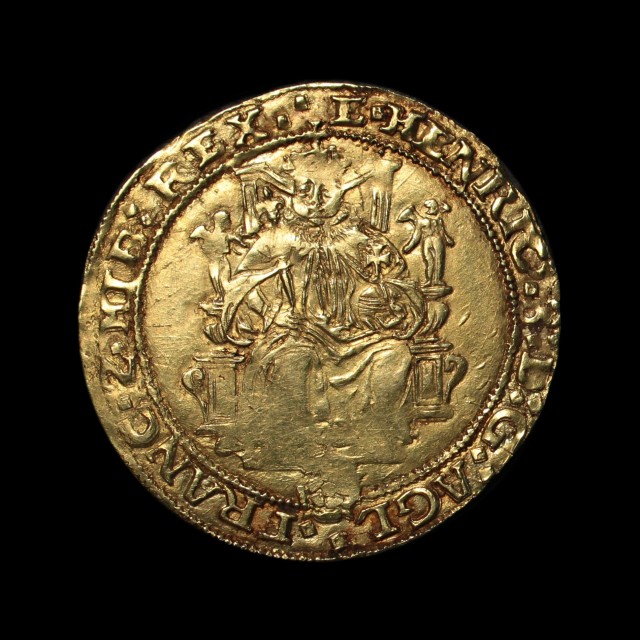 In the name of Henry VIII, youthful portrait of Edward VI enthroned, rose below, mm. E, HENRIC 8, Roman lettering, rev. crowned shield or arms supported by lion to left, griffin to right, E below, 6.24g, (S.2394, N.1866). Some weakness of strike to the bottom of the king's robes, otherwise a full example of the type with some sharp details, good very fine.