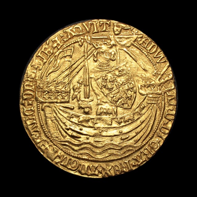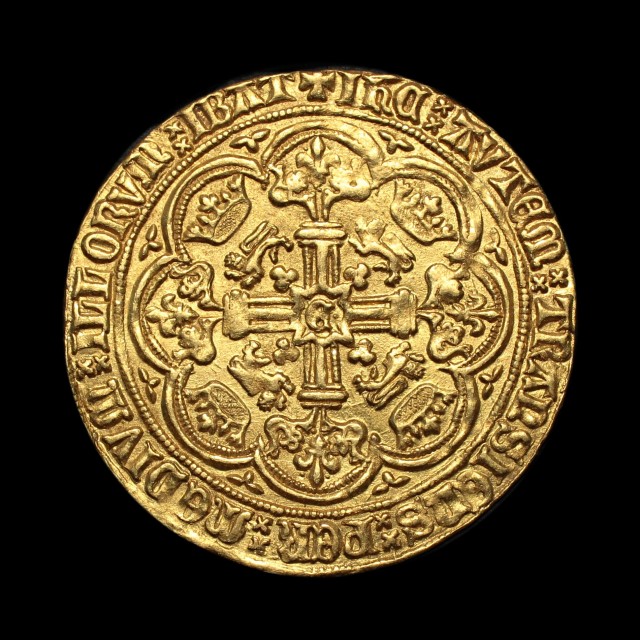 Calais, French title, flag at stern , saltire stops, rev. E and pellet in centre, mm. cross pattee, (without pellets), double saltire stops, 7.73g (S.1521, N.1281) . Small flaw on king's face, well struck and full, good very fine and scarce.