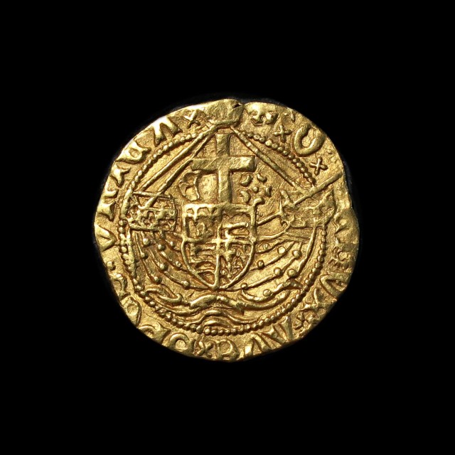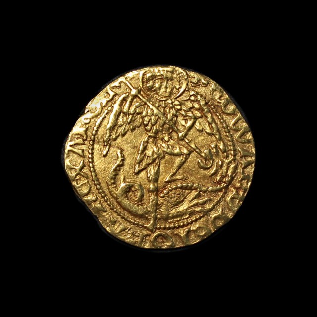 St. Michael spearing the dragon, rev. ship with E and rose beside mast, 2.45g, (S.2093, N.1630). Dumpy flan but full weight, very fine or better.
