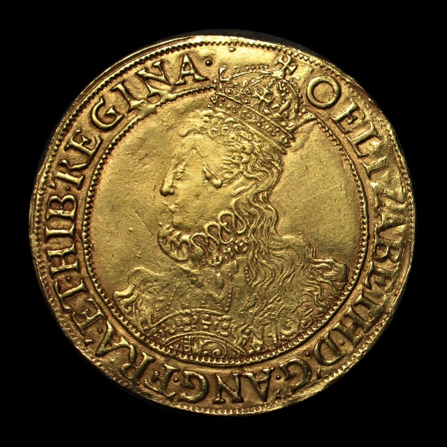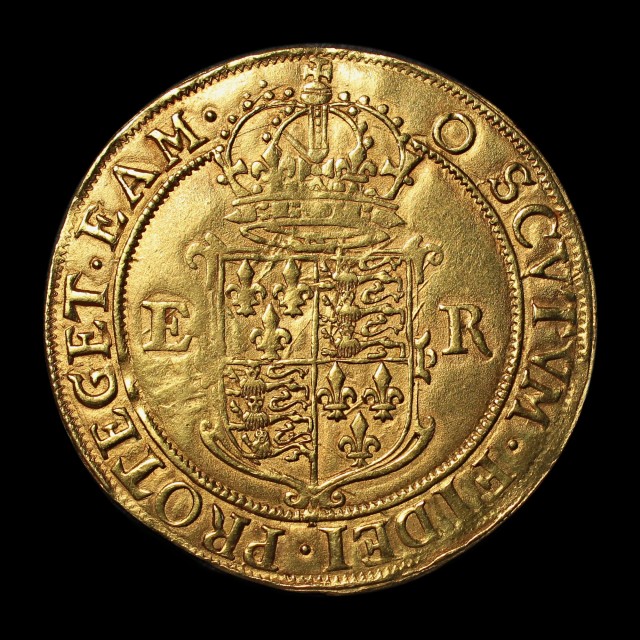 Elaborately decorated bust l. mm. 0, rev. crowned shield dividing ER, mm. to right of crown, 11.25g, (S.2534, N.2008). Small raised flaw on queen's cheek, otherwise about very fine and rare.