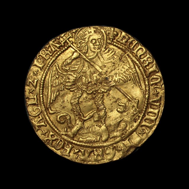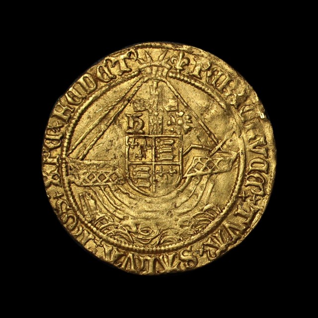 HENRIC VIII, St. Michael spearing dragon, saltire stops, rev. shield within ship, cross above dividing H and rose, mm. lis, 5.14g, (S.2268, N.1783). Slightly scuffed (a field find), otherwise better than very fine and very rare.