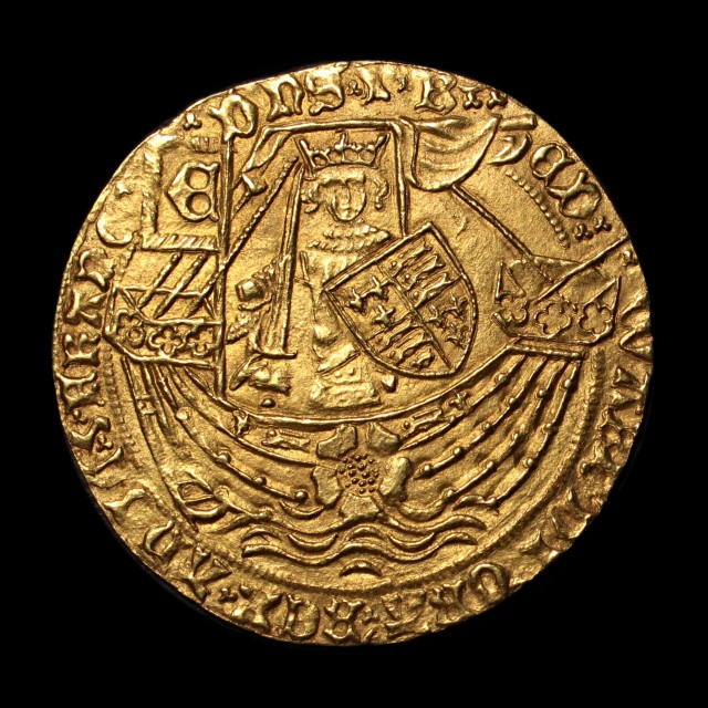 London, type VII, mm. -/crown, king crowned, standing facing in ship holding sword and shield, rose on hull, flag at stern, rev. rose on radiant sun over floriate cross, crowned leopards in angles, trefoil stops, small trefoils in spandrels, 7.72g, (S.1951, N.1549). Full, round and about extremely fine, an attractive example.