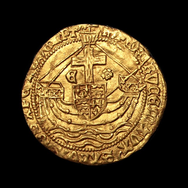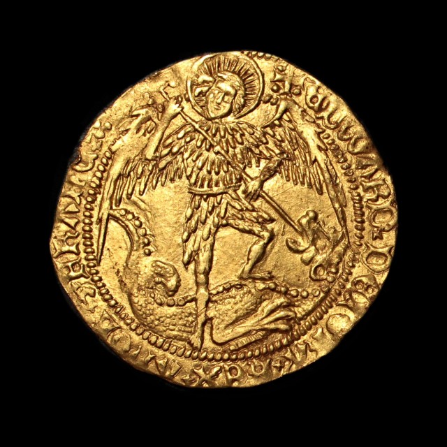 London, type XVI, mm. cross and four pellets, St. Micheal spearing the dragon, rev. ship with E and rose beside mast, 5.08g, (S.2091, N.1626). Small scuff on reverse but probably the sharpest angel of this reign we have seen, extremely fine